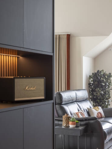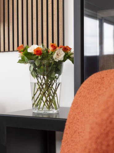 J’ai eu le plaisir d’imaginer une ambiance chaleureuse, accueillante, en proposant quelques choix audacieux : un tapis léopard gansé orange, un revêtement mural effet fourrure, une belle suspension, un meuble sur mesure, de beaux rideaux en velours..et plus encore.