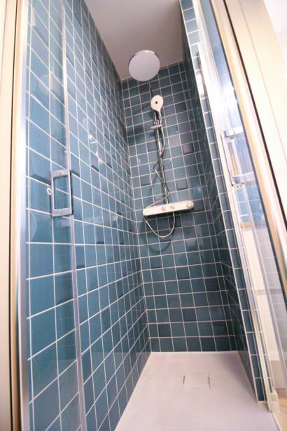 Les clients avaient une envie bien précise : créer une ambiance bord de mer, avec une teinte bleu-vert dominante. Pour répondre à cette demande, j’ai proposé un sol à motif chevrons, élégant et lumineux, en harmonie avec des matériaux durables et des aménagements sur mesure.