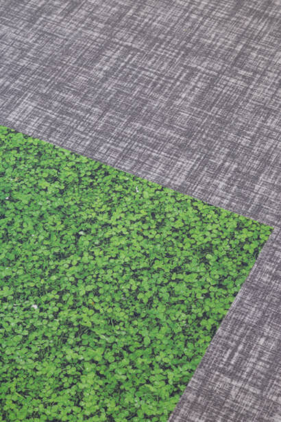 J’ai choisi de faire entrer la nature dans chaque espace, de manière subtile mais très présente. Le parti pris le plus fort a été ce sol au motif trèfle, particulièrement réaliste, qui donne immédiatement une identité forte à la salle de réunion.