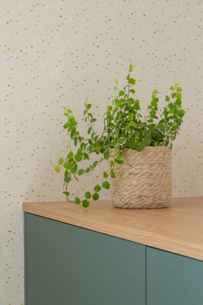 Ce sont souvent les détails qui font toute la différence. Dans ce projet, j’ai voulu créer de la surprise et du caractère grâce à quelques éléments forts : des singes qui semblent grimper sur les murs, un plafond végétal suspendu, une suspension originale avec ses Playmobil, des motifs floraux ou encore des revêtements muraux plus audacieux.