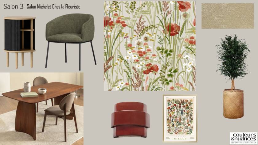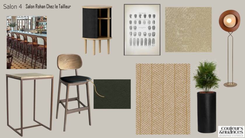 J’ai choisi d’organiser l’espace en plusieurs salons intimistes, chacun associé à un métier : fleuriste, tailleur, mercière, boucher… Chaque univers devient ainsi une petite scène, avec son ambiance, ses codes et ses clins d’œil subtils. Cette narration permet d’ancrer le lieu dans un imaginaire artisanal fort et authentique.