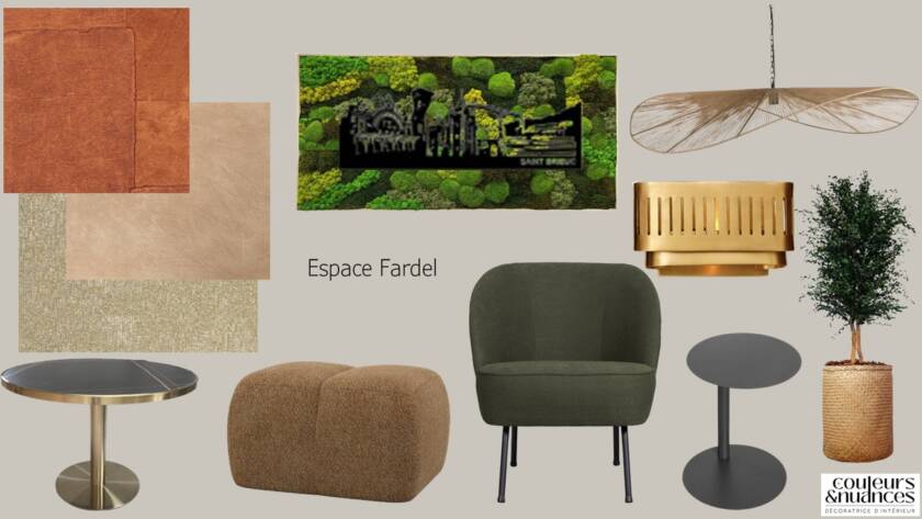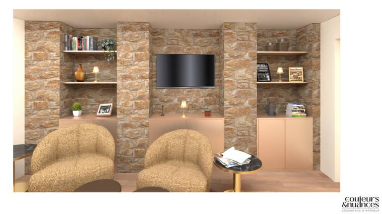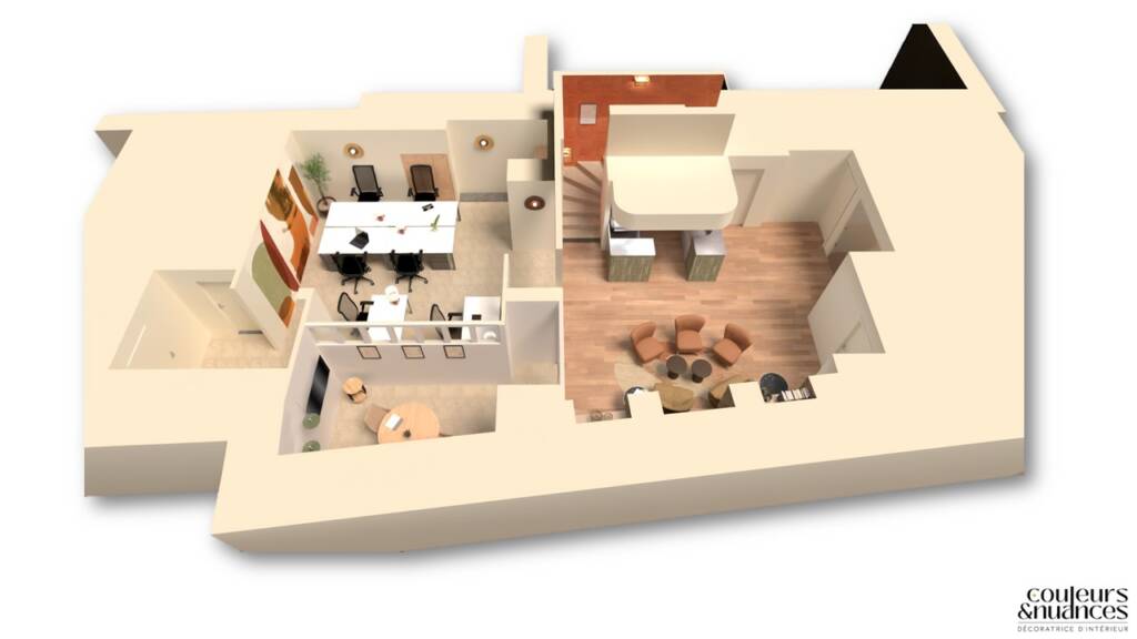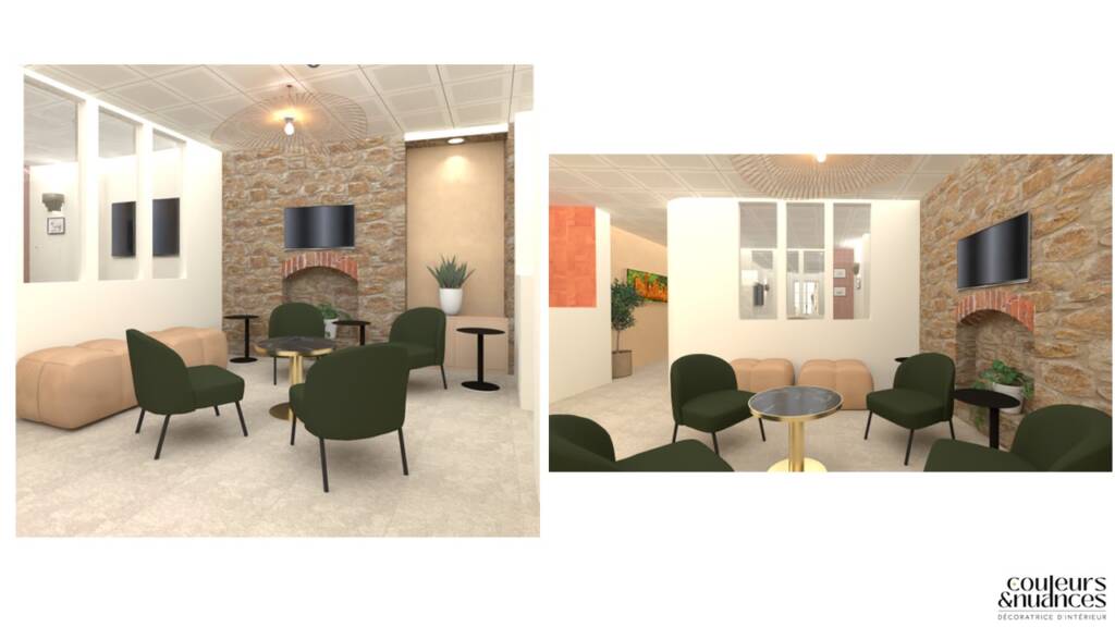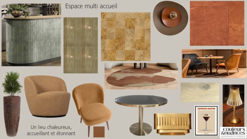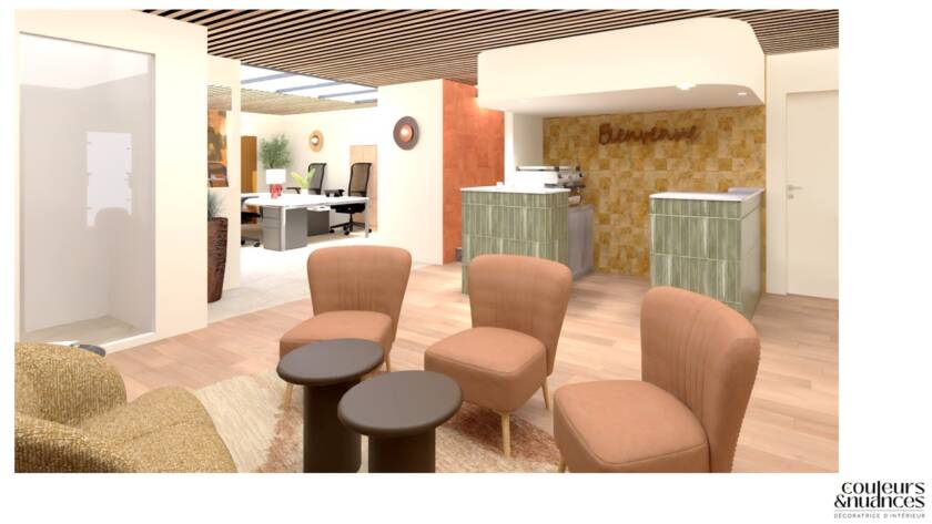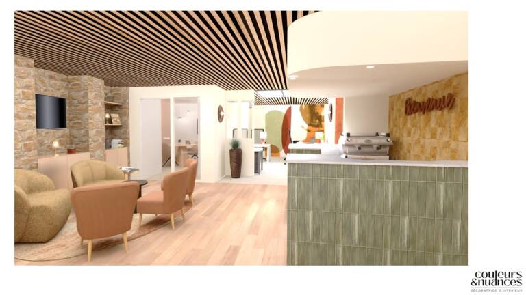 Les couleurs ont été choisies volontairement chaleureuses pour insuffler énergie et convivialité. Les bruns et beiges structurent les volumes, tandis que les touches d’orange et de vert dynamisent l’ensemble. L’atmosphère se veut enveloppante, presque joyeuse, sans jamais perdre en élégance.