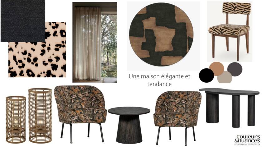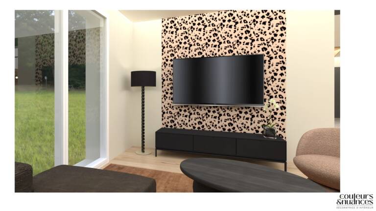 un revêtement léopard, un décor mural à effet broderie, et une palette de couleurs sourdes et douces.