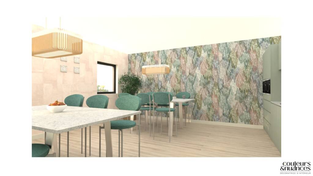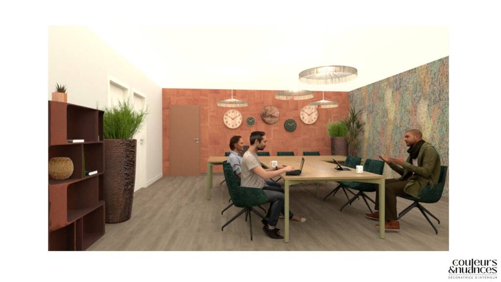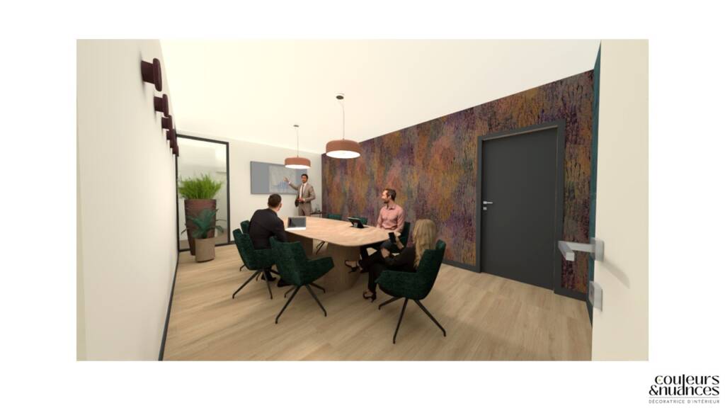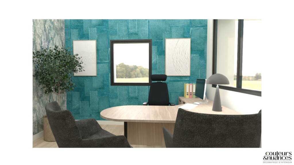 Ici j’ai proposé une salle de travail conviviale et dynamique, où le papier peint texturé aux reflets colorés apporte rythme et personnalité.