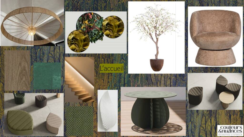 Ce projet de décoration de cette entreprise illustre bien ma démarche : créer des espaces cohérents, élégants et chaleureux, où chaque matériau, couleur ou luminaire a un sens. Parce que dans un projet de décoration, tout commence par une ambiance… et ici, elle s’annonce vivante, naturelle et inspirante 🌿
